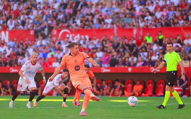 第10分钟,阿劳霍防守犯错,放倒了对手,裁判给了塞维利亚点球。36岁的桑切斯主罚命中,攻破旧主球门。巴萨0-1落后。进球后,桑切斯疯狂庆祝。
